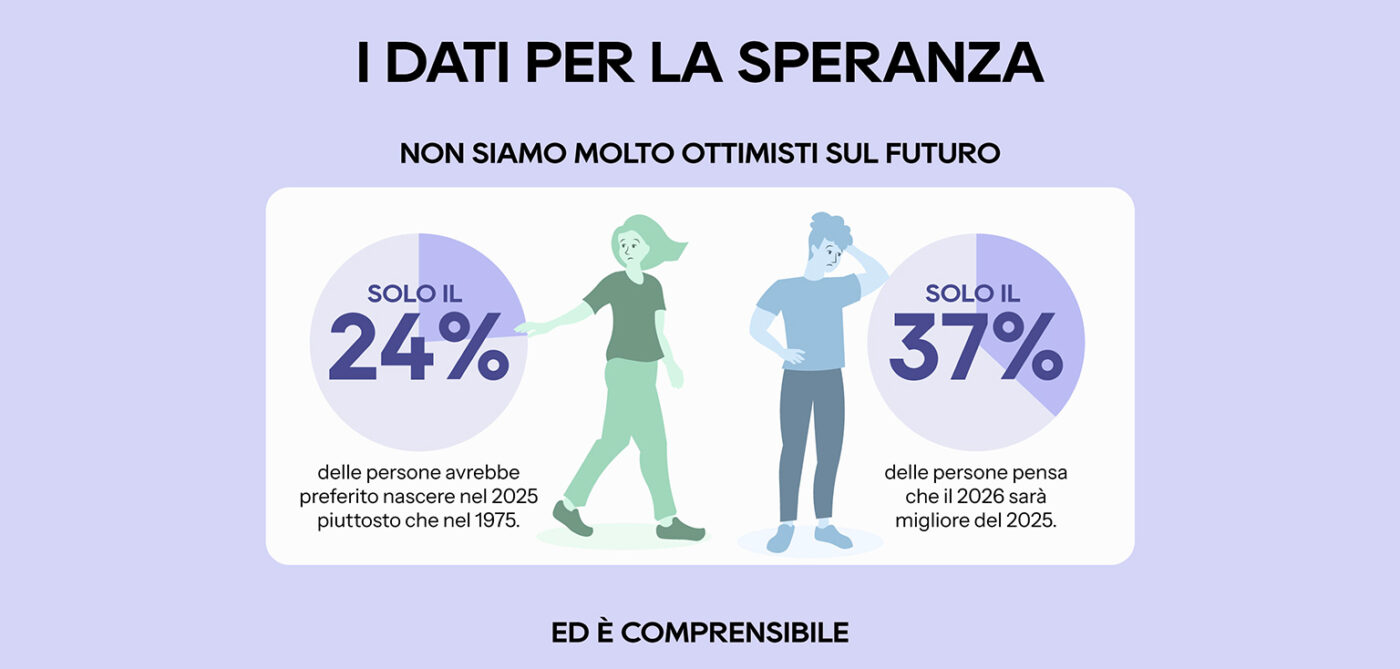 Lo scopo di ogni illustrazione è comunque quello di rafforzare il concetto a cui si riferisce. Per esempio, in alto pianifico una figura che guarda indietro da abbinare a una statistica sulla percentuale di persone che avrebbe preferito nascere nel 1975 piuttosto che nel 2025, e una figura che guarda avanti in modo incerto da abbinare alla statistica sulla percentuale di persone che pensano che il 2026 sarà migliore del 2025.
