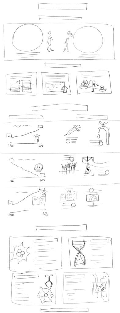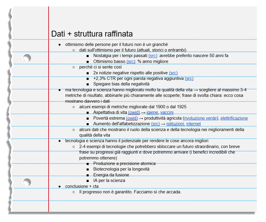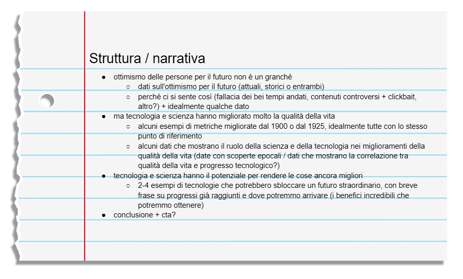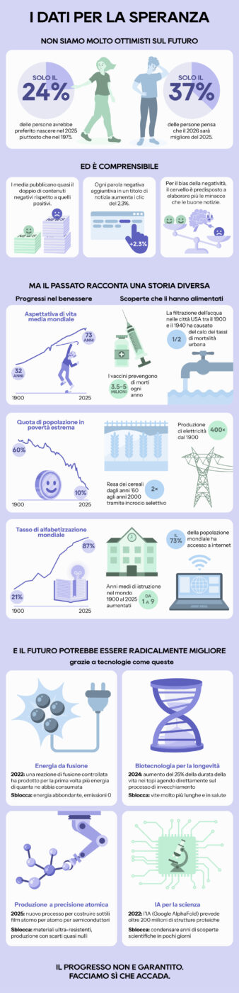 Per questa infografica, decido di iniziare presentando delle statistiche sulla poca fiducia che abbiamo nel futuro e il meccanismo psicologico dietro a questa percezione. Farò poi degli esempi di come la nostra qualità della vita sia migliorata solo nel secolo scorso ed elencherò alcune delle scoperte o invenzioni che hanno reso possibile questo progresso. Terminerò con degli esempi di tecnologie che stanno venendo sviluppate in questo momento e che potrebbero rendere il futuro di gran lunga migliore, e una breve call to action.