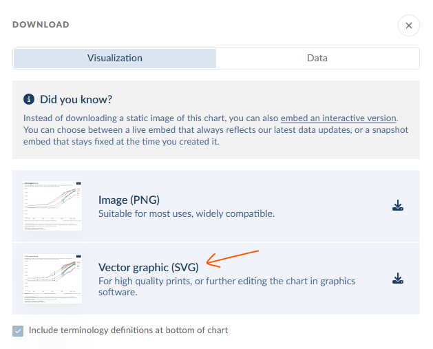 Se i siti da cui scarico i dati hanno la possibilità di scaricare grafici in SVG, la sfrutto: posso così essere sicura di avere grafici 100% accurati ma anche modificare lo stile a mio piacimento.