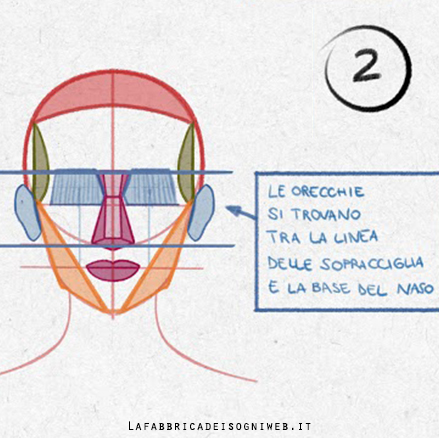 Ricorda che nella visione frontale le orecchie si trovano tra la linea delle sopracciglia e la base del naso mentre, inclinando la testa, le orecchie cambiano posizione seguendo la prospettiva della testa.